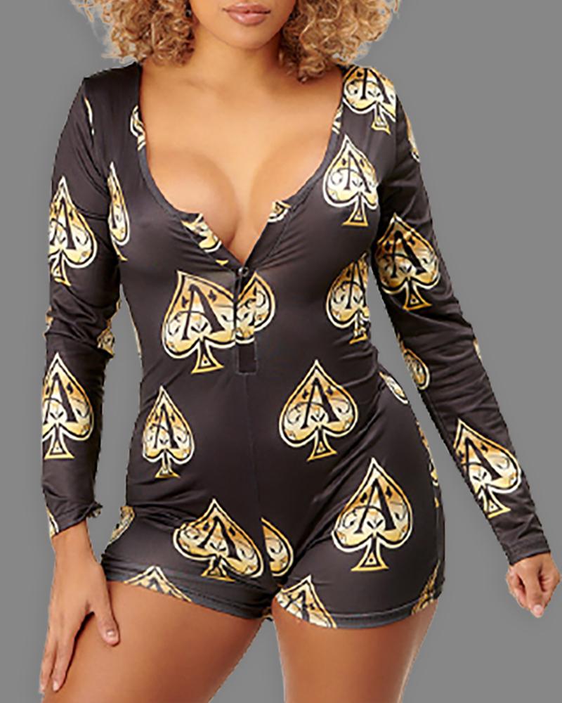 All Over Print Long Sleeve Functional Buttoned Design Romper, Black