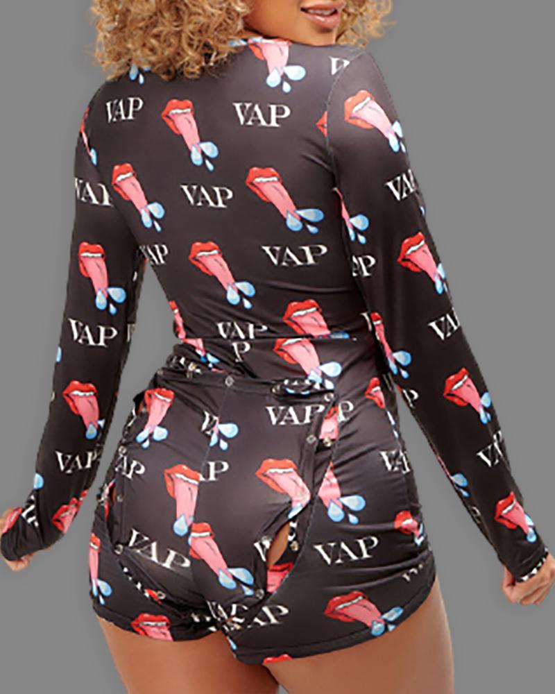 All Over Print Long Sleeve Functional Buttoned Design Romper, Red