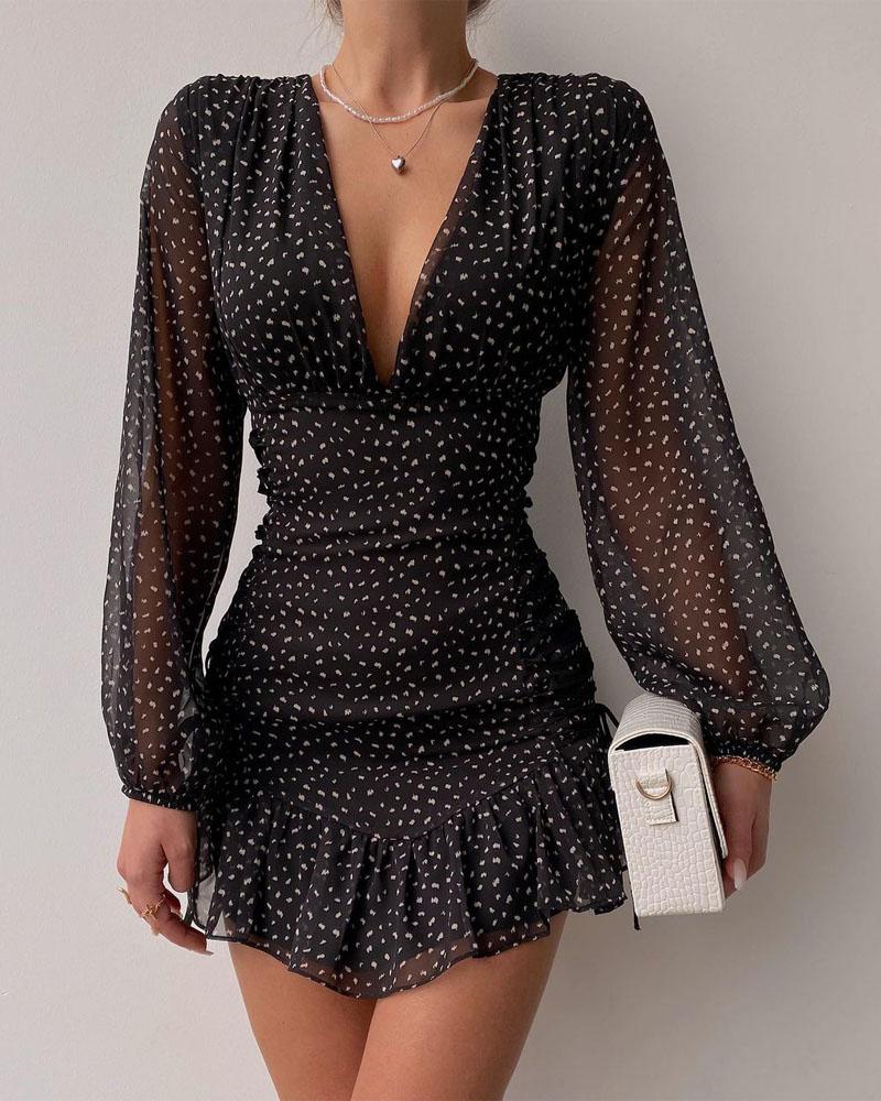All Over Print Ruffle Hem Ruched Bodycon Dress, Black