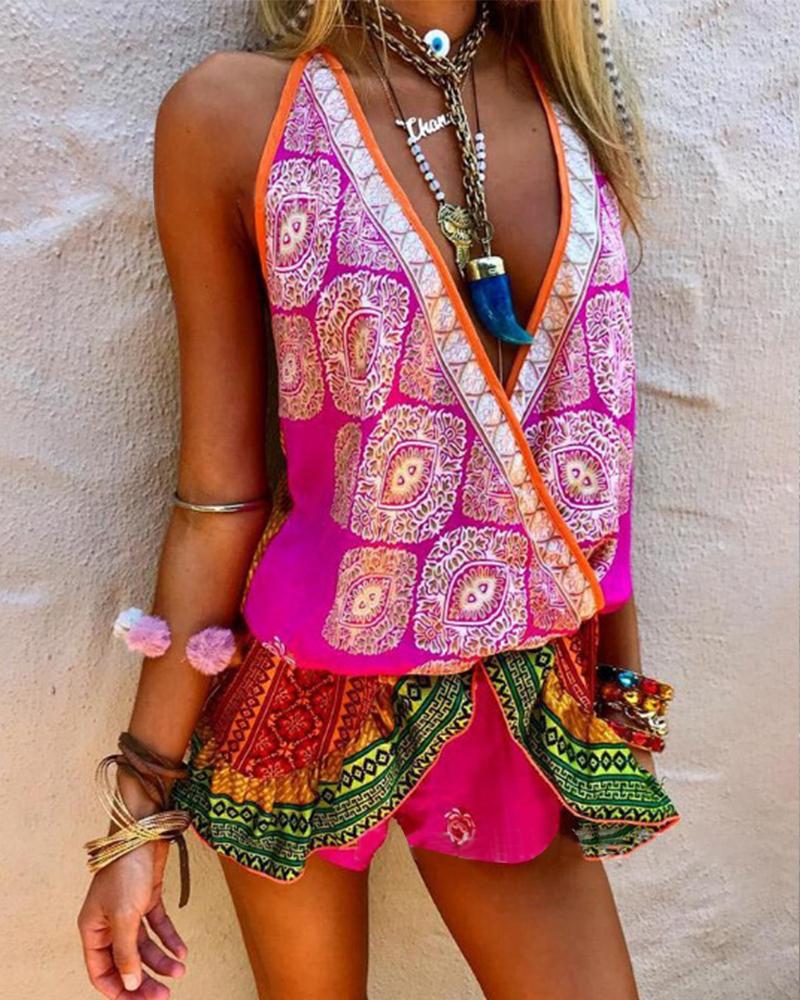 All Over Print Ruffle Hem Sleeveless Rompers, Purple