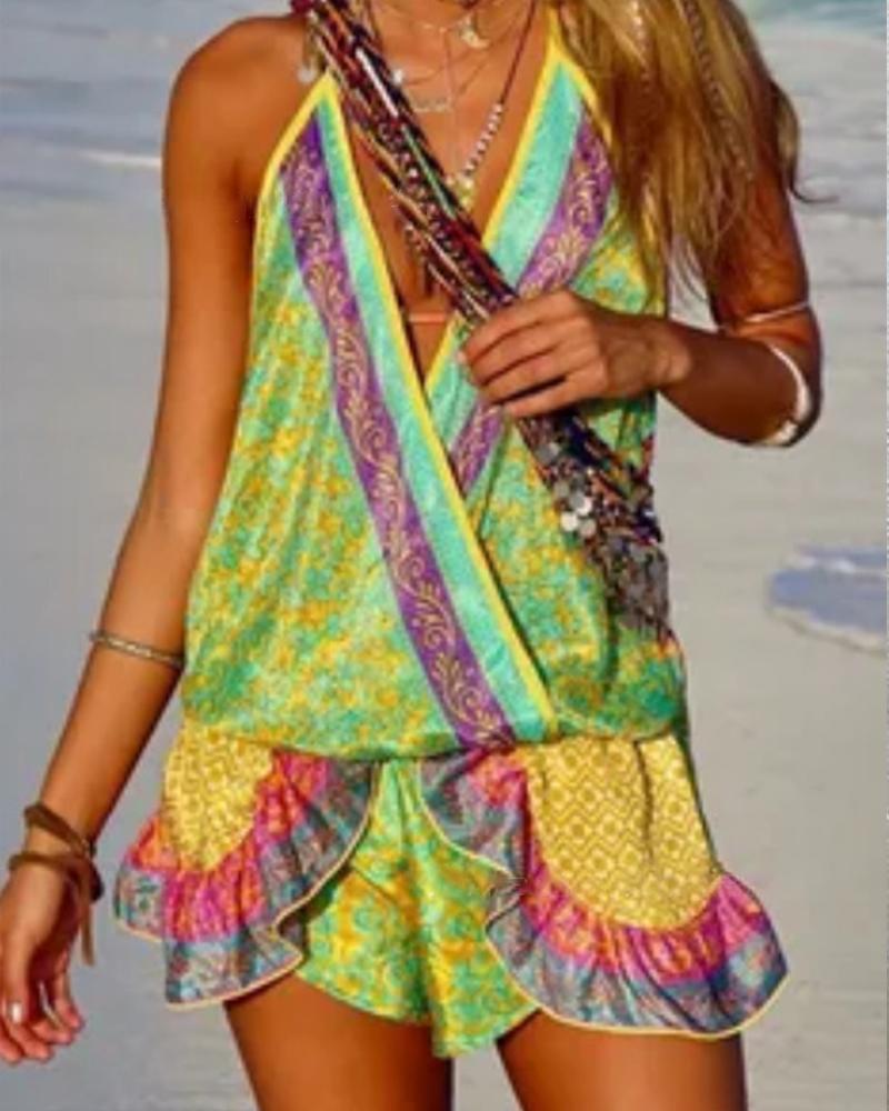 All Over Print Ruffle Hem Sleeveless Rompers, Yellow