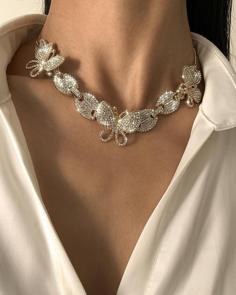 Allover Rhinestone Butterfly Pattern Retro Necklace, Gold