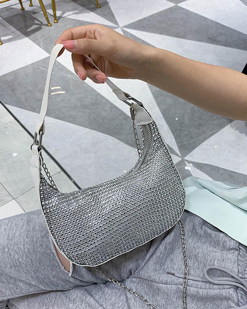 Allover Rhinestone Decor Chain Strap Baguette Bag, Silver