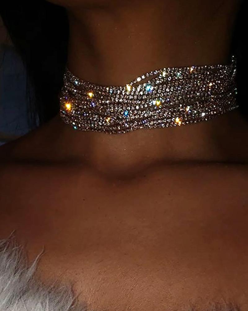 Allover Rhinestone Wide Layered Choker, Silver