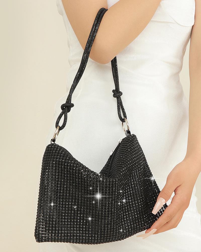 Allover Rhinestone Zipper Design Evening Shoulder Bag, Black