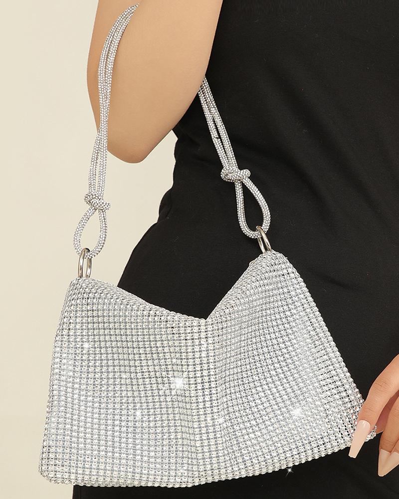 Allover Rhinestone Zipper Design Evening Shoulder Bag, Silver