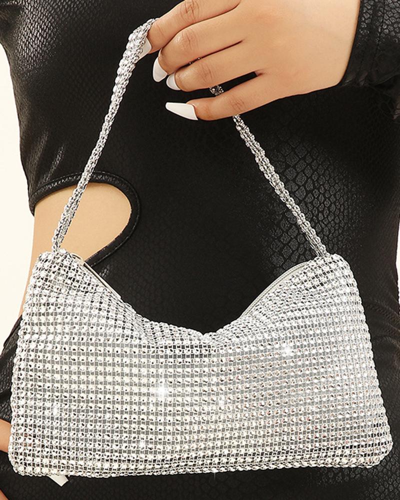 Allover Rhinestone Zipper Detail Evening Shoulder Bag, Silver