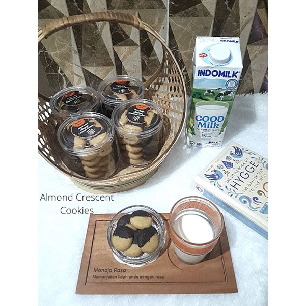 Ready Almond Crescent Cookies, gurih renyah aroma khas butter, almond & lelehan coklat. Dewasa ataupun anak - anak pasti suka. Cocok banget utk teman ngopi atau ngeteh.