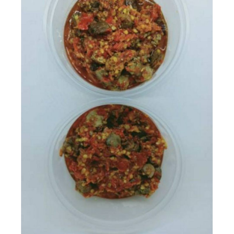 Ampela ayam yg di potong2 diberi bumbu sambal mercon yang pedas per cup UK 300ML berat 200gr