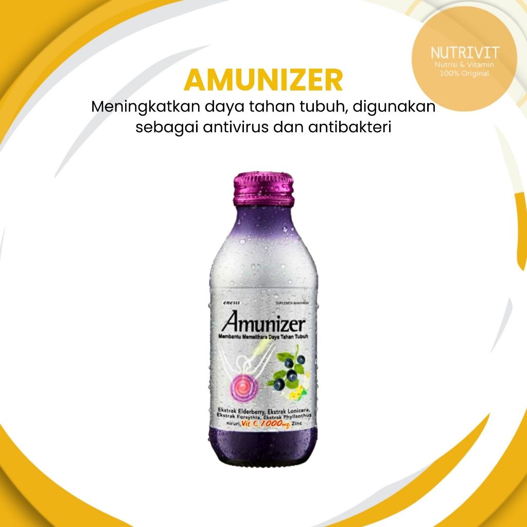Amunizer Amunizer Botol 140 ml x 3 pcs adalah supplement untuk melawan virus dan menjaga daya tahan tubuh secara intensif. Mengandung: 1) Vitamin C 1000mg : bantu daya tahan tubuh secara intensif 2) Khasiat Elderberry: di Eropa umum dipakai untuk antivirus flu, juga sebagai anti oksidan tinggi 3) Zinc : system kekebalan tubuh 4) Herbal Lonychera : anti virus flu 5) Forsythia : cegah infeksi bakteri 6) Phyllantus: cegah virus dan bakteri Amunizer Broad Spectrum Support! Pelawan virus, bantu daya tahan tubuh secara menyeluruh. BPOM SD201637251