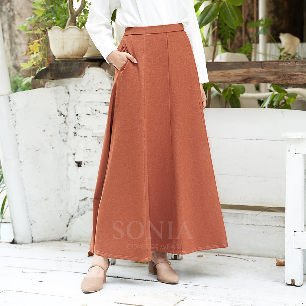 Mengapa pilih produk SONIA?SONIA adalah busana pilihannya jutaan wanita Indonesia sejak tahun 1992. Model model pakaian kami selalu up to date dan trendy! Produk pakaian SONIA hanya menggunakan bahan-bahan terpilih yang kualitasnya sangat tinggi. Bahan tekstil yang digunakan selalu tebal namun tetap adem, nyaman dan tidak nerawang ketika dipakai. Silahkan cek ulasan toko kami kalau masih ragu dengan produk SONIA.Harganya lumayan mahal ya?Jelasnya harga sesuai kualitas ya kak, daripada beli yang murah sekali cuci langsung luntur & melar bahannya, rugi kan kalau harus beli lagi? Kalau beli produk SONIA dijamin tetap awet untuk dipakai bertahun tahun kedepan!Nama Produk: Andraya SkirtKode Produk: R1626•Bahan : Denim Double Knit-nya bertexture khas celana jeans namun elastis dan super nyaman.•Warna: Black, Gray, Navy, Army Green, Dark Brown, Maroon, Dark Orange, Light Brown, Brown (dari kiri ke kanan)•Ukuran: All SizeLingkar pinggang: 70-100cmLingkar Pinggul: 110cmLingkar Bawah: 262cmPanjang 98cm