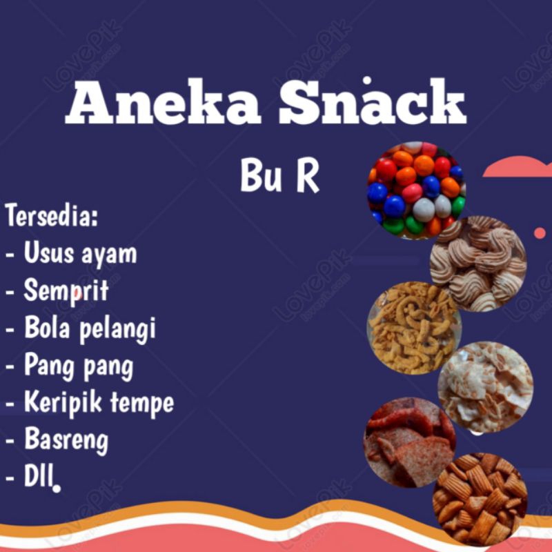(usus ayam krispi, basreng, semprit, pang pang, keripik tempe, bola pelangi dll)