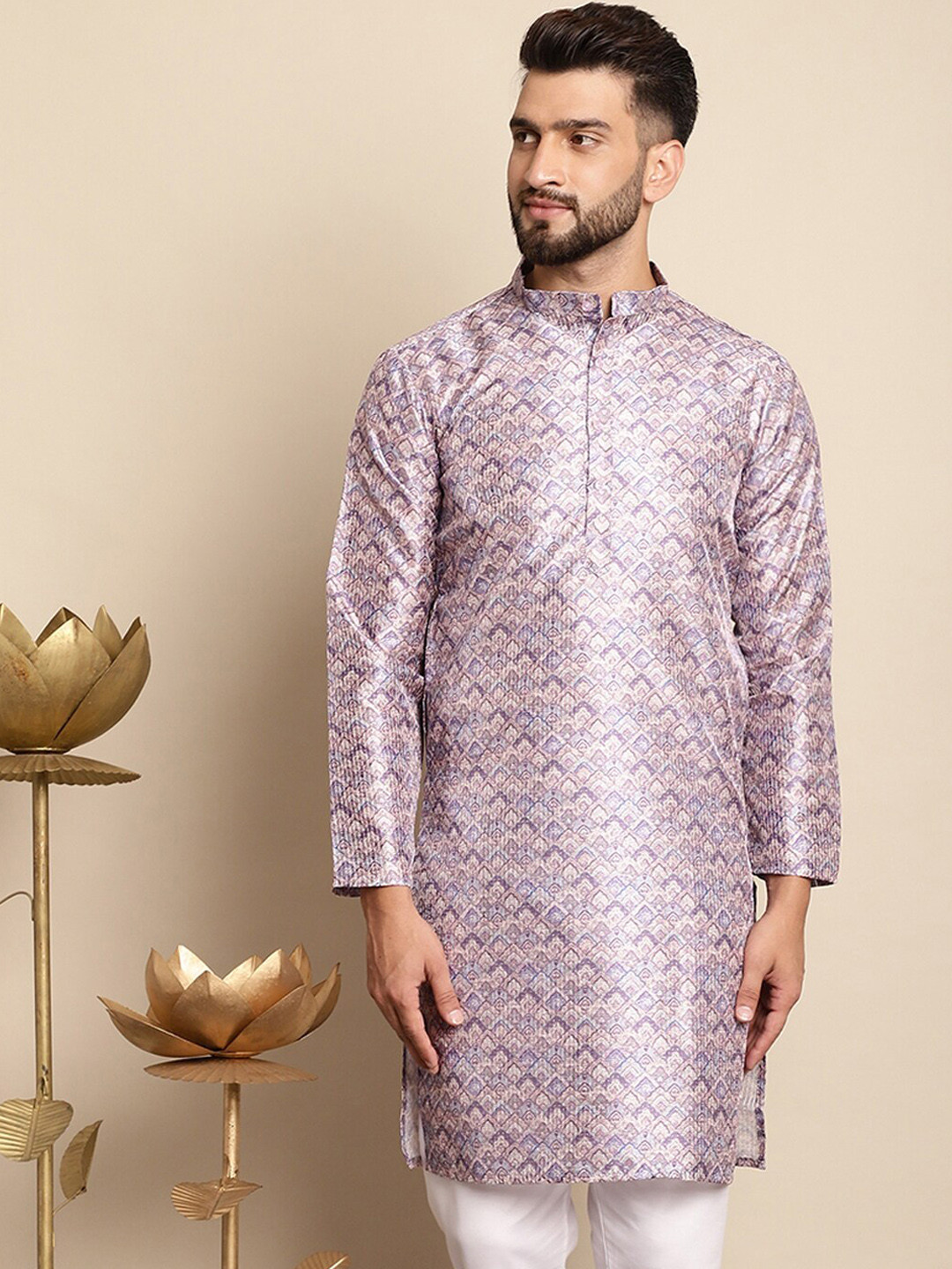 Colour: purple Woven design Mandarin collar Long, regular sleeves Straight shape with regular style Thread work detail Above knee with curved hem Machine weave regular jacquard
