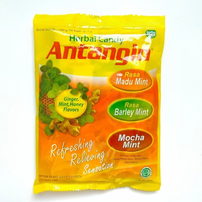 Permen herbal dari ahlinya herbal yaitu antangin perman. Dalam 1 kemasan terdapat 3 varian rasa yaitu madu mint, barley mint dan mocha mint.