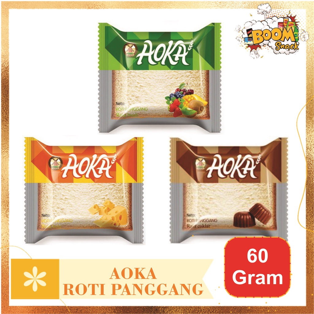 AOKA Roti Panggang dengan bentuk sandwich roti tawar, berisi krim dan selai sebagai varian rasanya. Dikemas dalam plastic pack singles yang higienis. Sudah mendapat PIRT dan Halal MUI.
