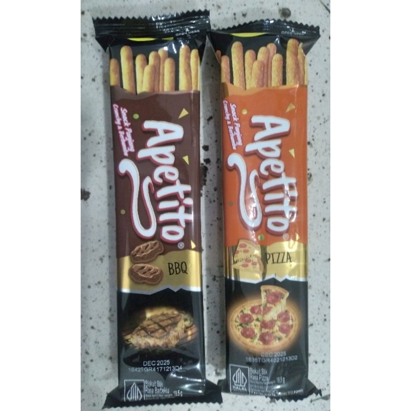 Apetito snack panjang crunchy & berbumbu rasa BBQ dan Pizza 18,5gr. Silahkan pilih varian yg diinginkan. harga untuk 1 bungkus.