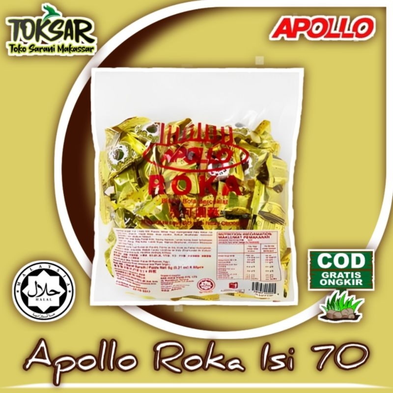 Apollo Roka adalah camilan wafer berbentuk bola yang dilapisi coklat dan kacang. Camilan ini renyah dan lezat, serta cocok untuk dinikmati kapan saja dan di mana saja.