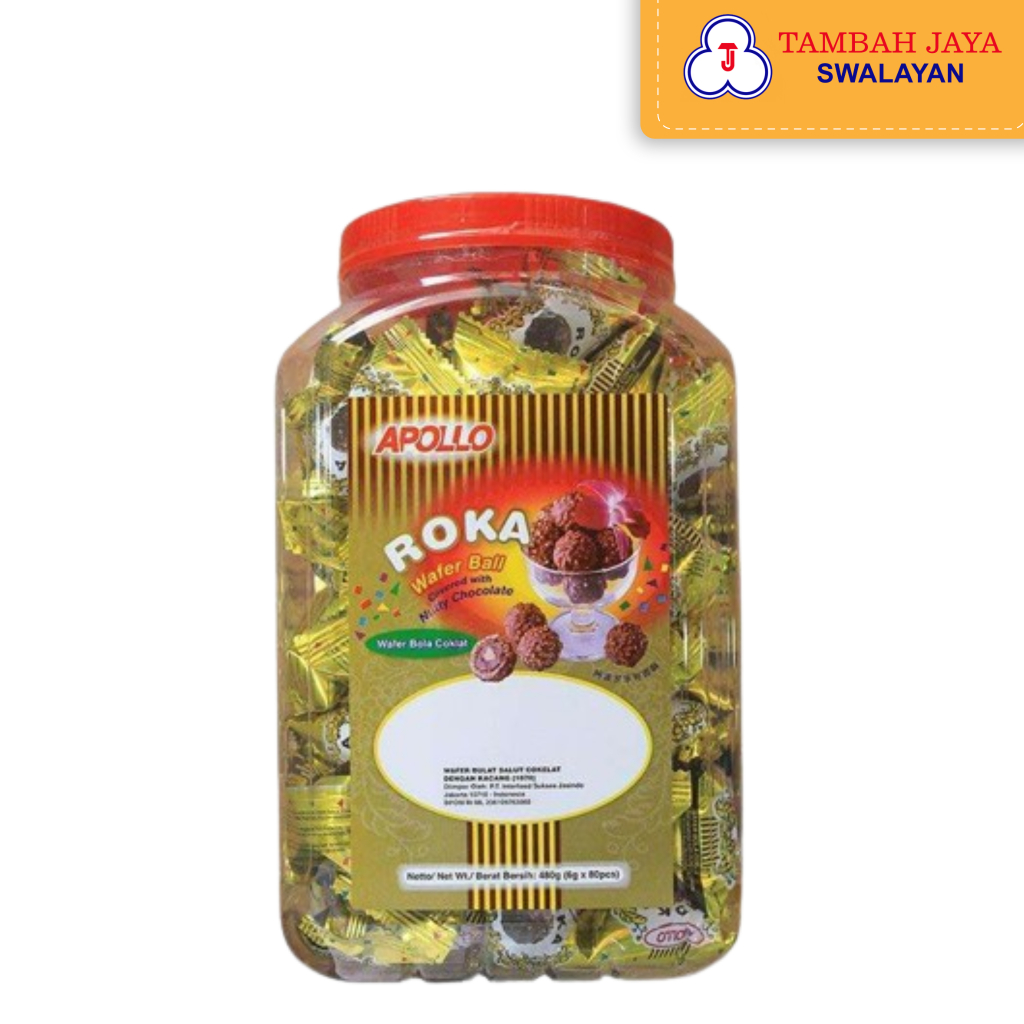 Apollo Roka Wafer Ball adalah camilan renyah yang terbuat dari wafer berbentuk bola dengan lapisan coklat lezat di dalamnya.