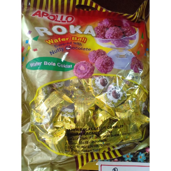 Apollo Roka Wafer Ball Wafer berbentuk bulat dilapisi cokelat dan kacang, camilan tempo dulu yang cocok untuk teman bersantai.