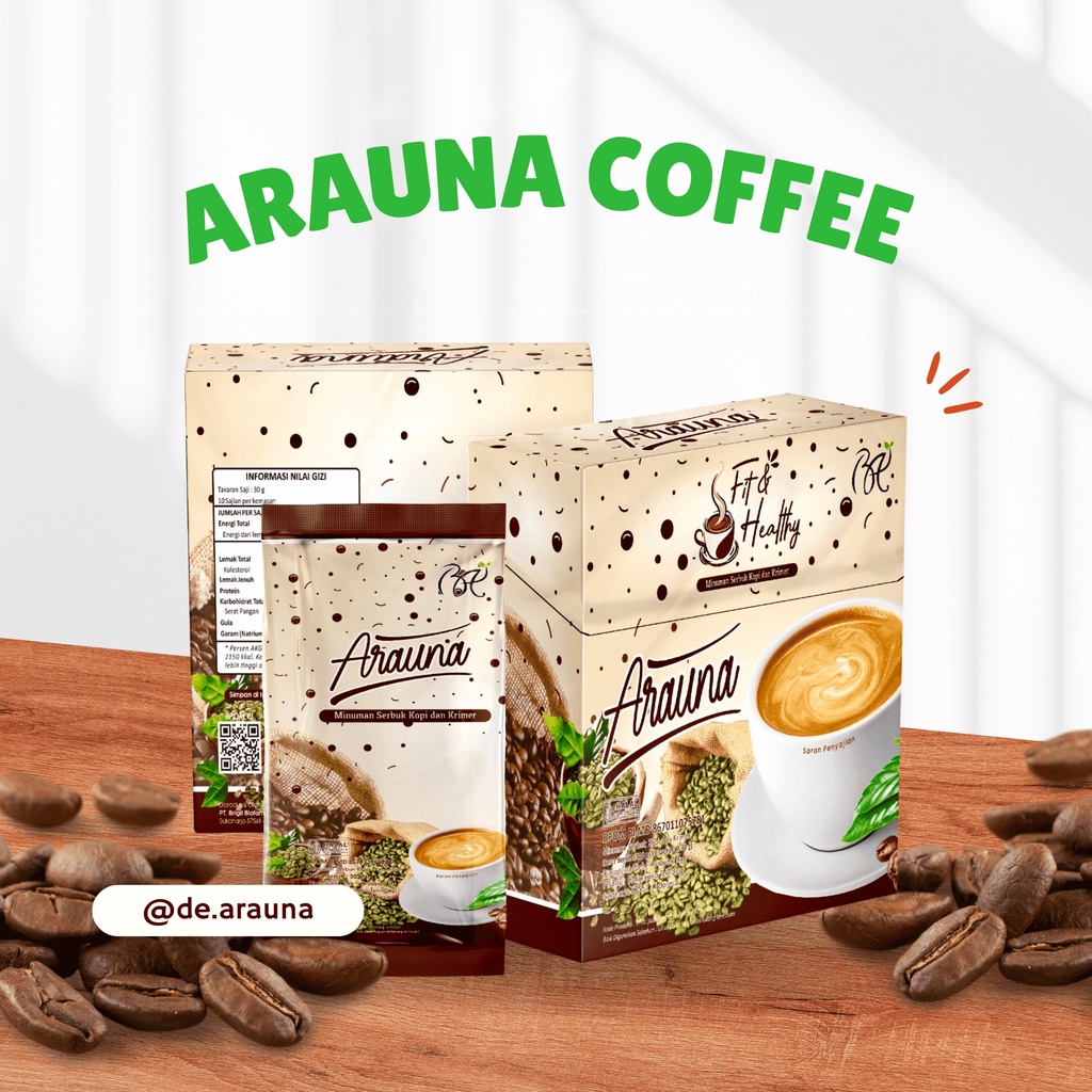 Green Coffe Extract di dalamnya yang tinggi asam klorogenat mempunyai aktivitas antioksidan yang lebih intens dan membantu memperlambat proses penyerapan karbohidrat. Arauna Coffe adalah minuman yang rendah kalori karena menggunakan pemanis alami stevia.
