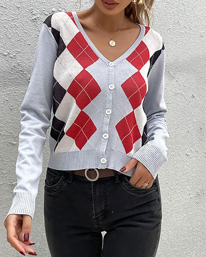 Argyle Print Colorblock Button Design Knit Cardigan, Gray