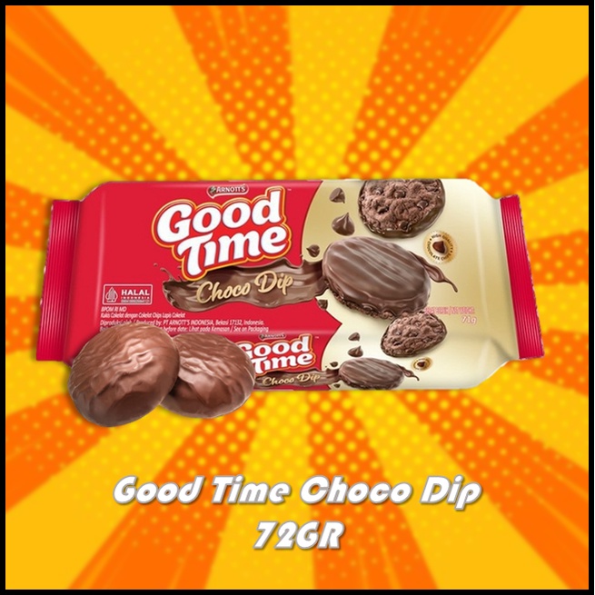 Good Time Choco Dip 71 gr adalah varian baru Good Time Cookies dengan balutan cream coklat diluarnya. Nikmatnya cookies yang manis wangi dan renyah ditambah denganbalutan cream coklat yang enak akan memberikan pengalaman makan yang istimewa untuk Anda dan keluarga. Good Time merupakan biskuit favorit setiap saat. Teksturnya yang renyah serta balutan cream coklat, memberikan kenikmatan disetiap gigitannya.