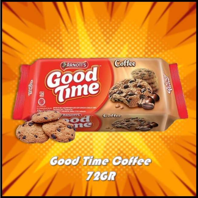 Good Time Coffee Chocochips Cookies 72 gr adalah varian Good Time Cookies rasa kopi. Nikmatnya kopi yang manis wangi dan renyah ditambah dengan taburan choco chips coklat yang pekat akan memberikan pengalaman makan yang istimewa untuk Anda dan keluarga. Good Time merupakan biskuit favorit setiap saat. Teksturnya yang renyah serta taburan Choco Chips Berlimpah memberikan kenikmatan disetiap gigitannya.