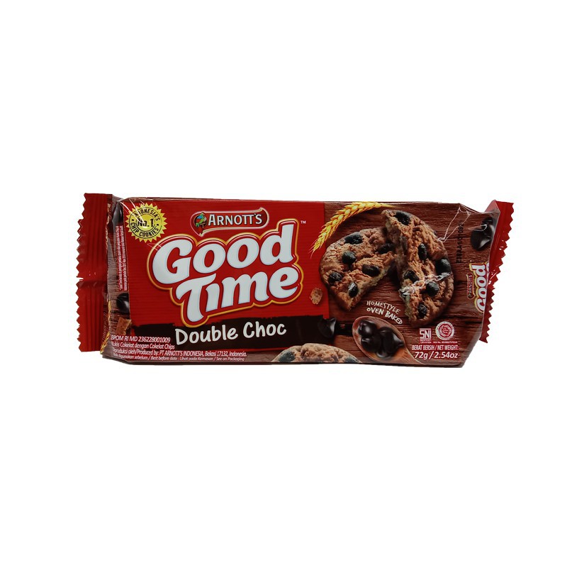 Good Time Cookies Double Choc [Pack 72 g], cokies coklat ini begitu membuminya di Indonesia melalui distribusi yg sangat baik dan memang rasanya yg benar2 pas. Kukis2 bulat yg enak dgn tekstur renyah yg baik, butir2 chocochipsnya yg cukup ga berlebihan dgn rasa coklat yg pas dan enak. Dan saat ini sudah banyak mempunyai varian juga, baik dari segi jenis kemasan/gramasi per pack, jenis kukisnya maupun warna chocochipsnya. BPOM RI dan Halal MUI.