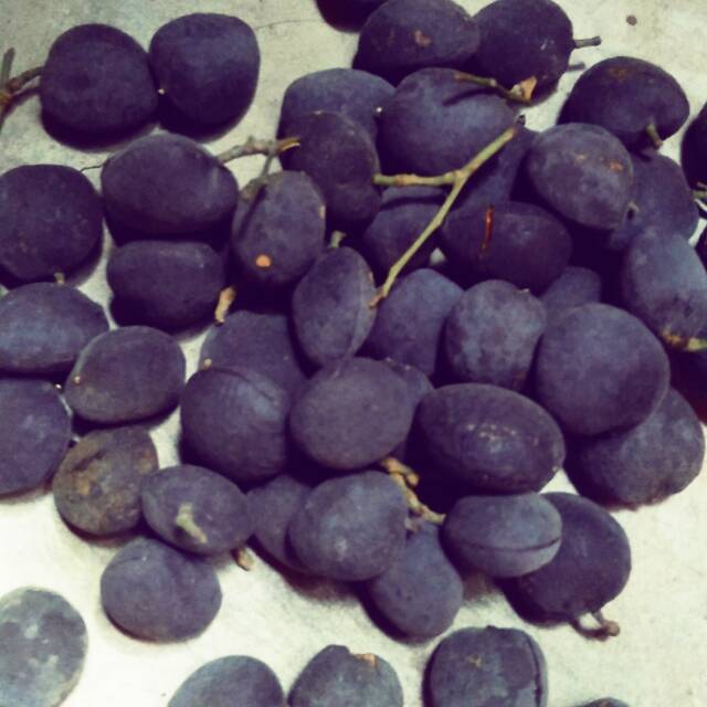 Kulit buah asam kranji yang sudah matang, berwarna abu-abu tua, berbulu halus seperti beludru.