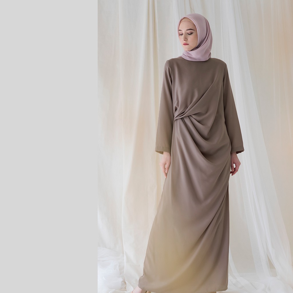 Gamis lengan panjang dengan detail drape kain pada bagian depan.