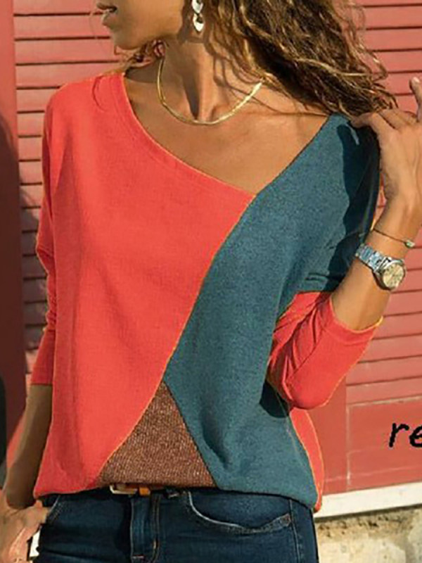 Asymmetric Neck Patchwork Color Block Long Sleeve T-Shirts