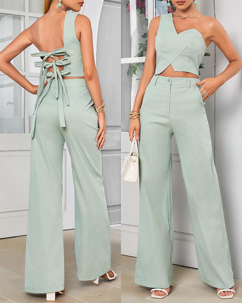 Asymmetrical Neck Tied Detail Crop Top & Wide Leg Pants Set, Green