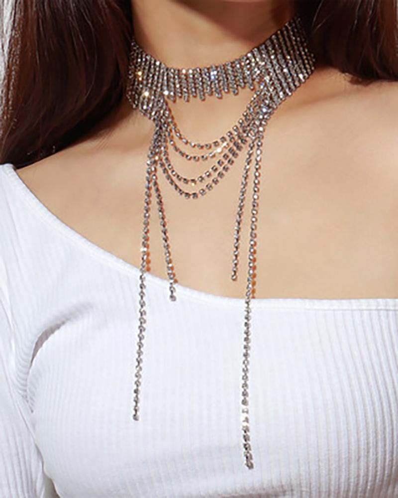 Asymmetrical Rhinestone Tassel Design Choker Necklace, Silver