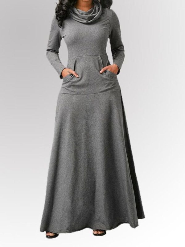 Autumn And Winter Solid Color Stitching Pocket Bib And Big Swing Long Dress