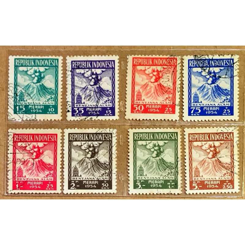 PRANGKO INDONESIA 1954 BENCANA ALAM MERAPI 8V COMPLIT SET USED.