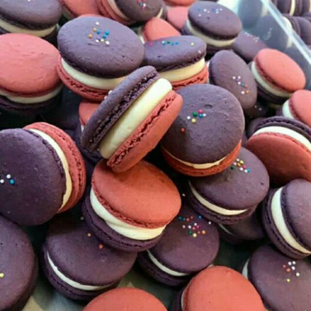 Selamat sore ... dapat salam dari macaron yg super gendut ini katanya kata kapan order macaronnya baby macaron rasa blueberry dengan rasanya yg asam dipadukan dengan aroma Red Velvet yg harum dengan isian coklat putih yang super gendut kalau digigit itu crunchy diluar nya dan lembut didalam ..rasa manis nya macaron dapet + asam buah blueberry nya mantap abis.bikin gak Eneng dan sempurna