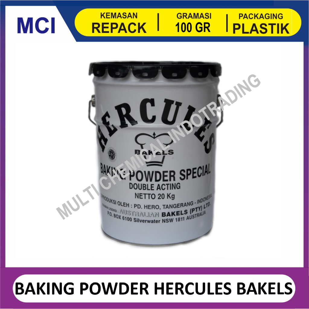 BAKING POWDER SPECIAL HERCULES BAKELS DOUBLE ACTING KEMASAN REPACK 100 GR DARI KEMASAN ASLI PAIL 20 KG