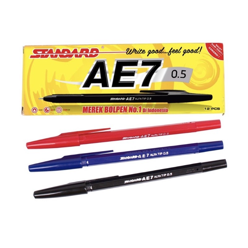 pulpen standard dengan mata 0.5 mm tersedia dengan tinta warna hitam, biru, dan merah.