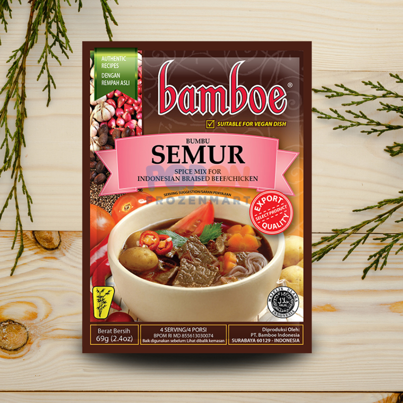 Bamboe Semur adalah bumbu instan dan praktis untuk membuat aneka olahan semur. Diproduksi menggunakan bahan pilihan seperti kecap, bawang merah, bawang putih, cabai, merica, cengkeh dan pala. Dapat digunakan untuk memasak aneka semur, daging sapi, ayam, lidah sapi, atau tahu. Dalam 1 kemasan 69 gram ini dapat digunakan untuk membuat 4 porsi semur.