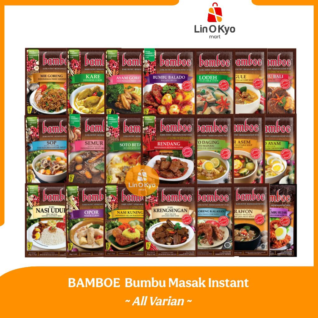 Bumbu BAMBOE EXPORT terbuat dari paduan bahan-bahan alami yang segar dan diolah secara higienis sehingga menghadirkan bumbu dengan citarasa dan kualitas ekspor. Praktis dan mudah digunakan untuk membantu membuat berbagai macam masakan tanpa perlu repot.