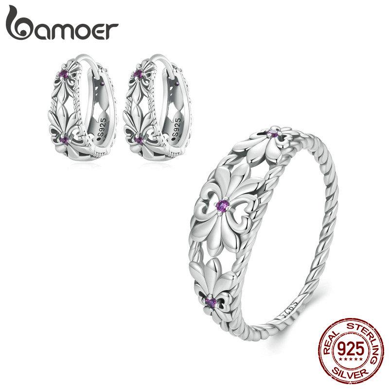 BAMOER, стерлинговое серебро 925 пробы, ретро кольцо и серьги с ирисом, комплект ювелирных изделий для женщин и девочек, ювелирные изделия, подарок на день рождения 8 серебряный