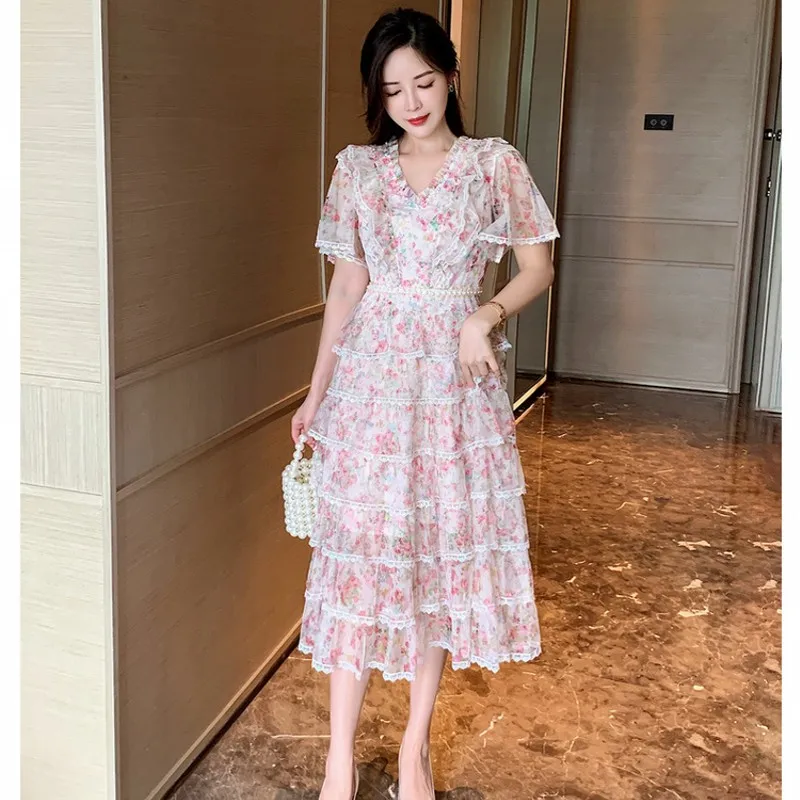 Floral Print Cake Dress Sexy V Neck Fashion Beading Short Sleeve Summer French Sweet Women Princess Long Dress