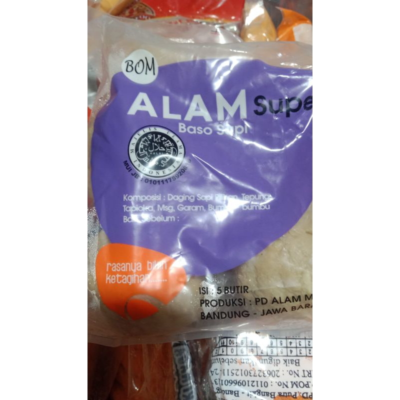 Baso sapi ALAM SUPER produk pangan yang terbuat dari daging yang dihaluskan, dicampur dengan tepung, dibentuk bulat-bulat sebesar kelereng atau lebih besar dan dimasak dalam air hingga bakso mengapung