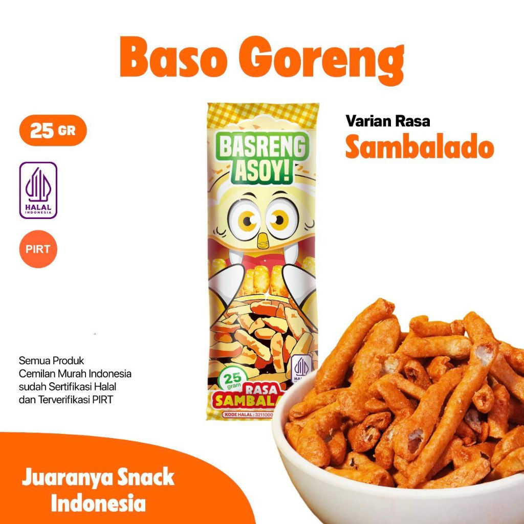 Basreng: Cemilan berbahan bakso goreng dengan tekstur kriuk dan cita rasa yang khas, tersedia dalam berbagai pilihan rasa seperti pedas, sambalado, daun jeruk