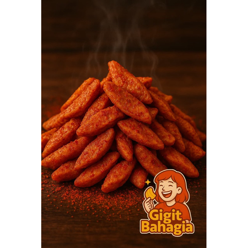 Cemilan kering kriuk berbentuk basreng dengan sensasi ORIGINAL, PEDAS, EKSTRA PEDAS!