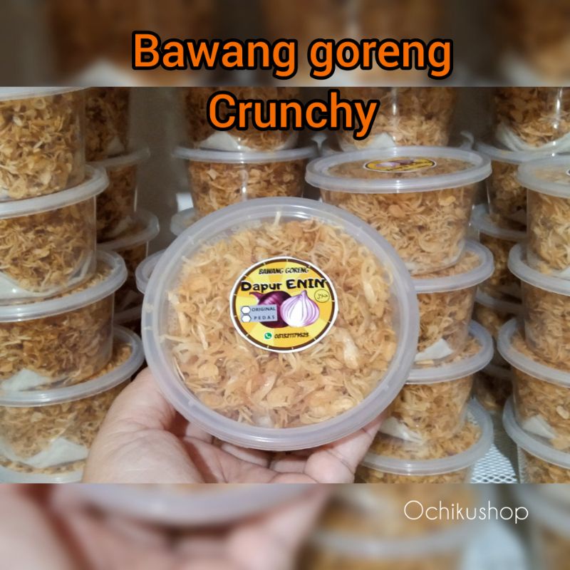 Bawang Goreng renyah dibuat dengan bawang merah pilihan. 100% Bawang merah Asli tanpa campuran tepung, yang diracik dengan bumbu spesial rahasia *dapur enin* yang bikin rasanya khas, gak ada duanya.