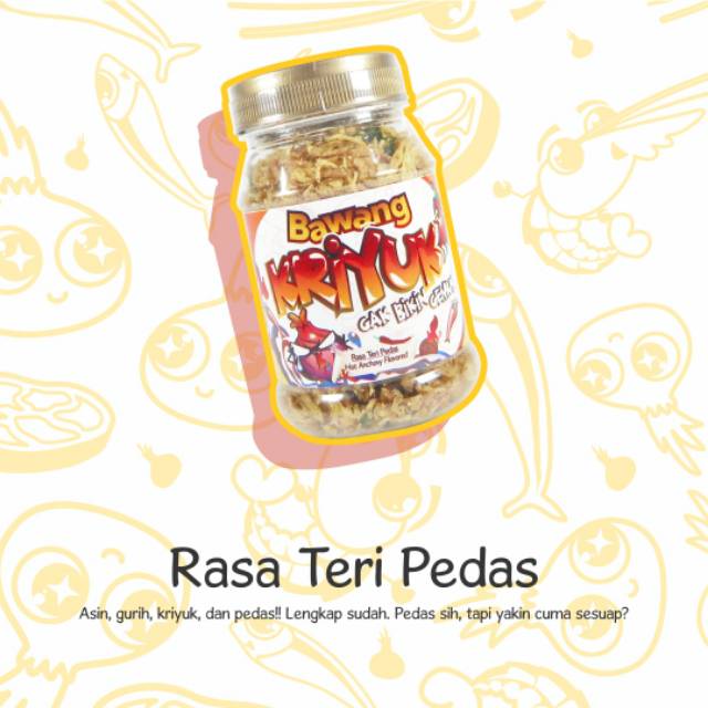 Bawang Goreng dengan campuran Teri dan Cabai asli akan membuat mulut Anda meledak2 karena Renyah dan Pedasnya dari varian ini Halal dan Non MSG sehingga aman dikonsumsi mulai anak2 sampai dewasa. taburkan Bawang Goreng pada nasi/mie/sup atau apapun sesuai selera anda.. dicemilin juga enak koook. AWAS KETAGIHAN.
