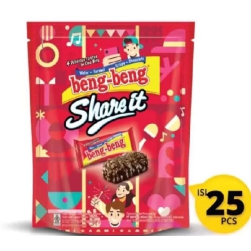 BENG-BENG Share It adalah wafer cokelat dengan rice crispy yang berbalut cokelat susu yang nikmat. Cemilan ini sangat cocok untuk cemilan dikala senggang, dimana saja dan kapan saja atau ideal juga dijadikan cemilan sehat saat santai Anda bersama keluarga. Setiap pack BENG-BENG Share It berisi 25 pcs dan kemasan 25 pcs isi beng-beng share it festive.