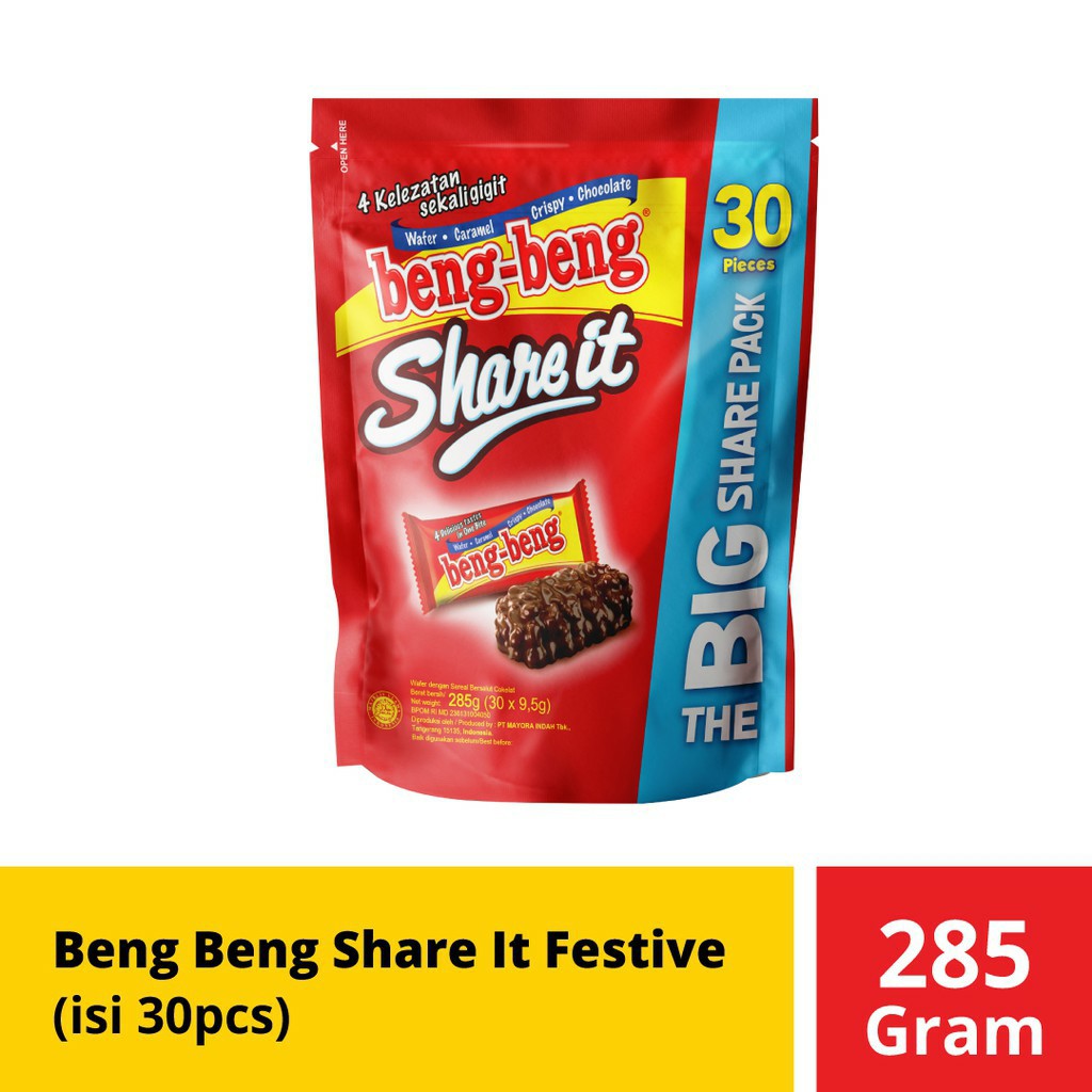 BENG-BENG Share It merupakan wafer cokelat dengan rice crispy yang berbalut cokelat susu yang nikmat. Lapisan cream yang lezat dan lembut, cemilan ini tidak bisa ditolak oleh segala usia. Sangat cocok untuk cemilan dikala senggang, dimana saja dan kapan sajaa atau ideal juga dijadikan cemilan sehat saat santai Anda bersama keluarga.