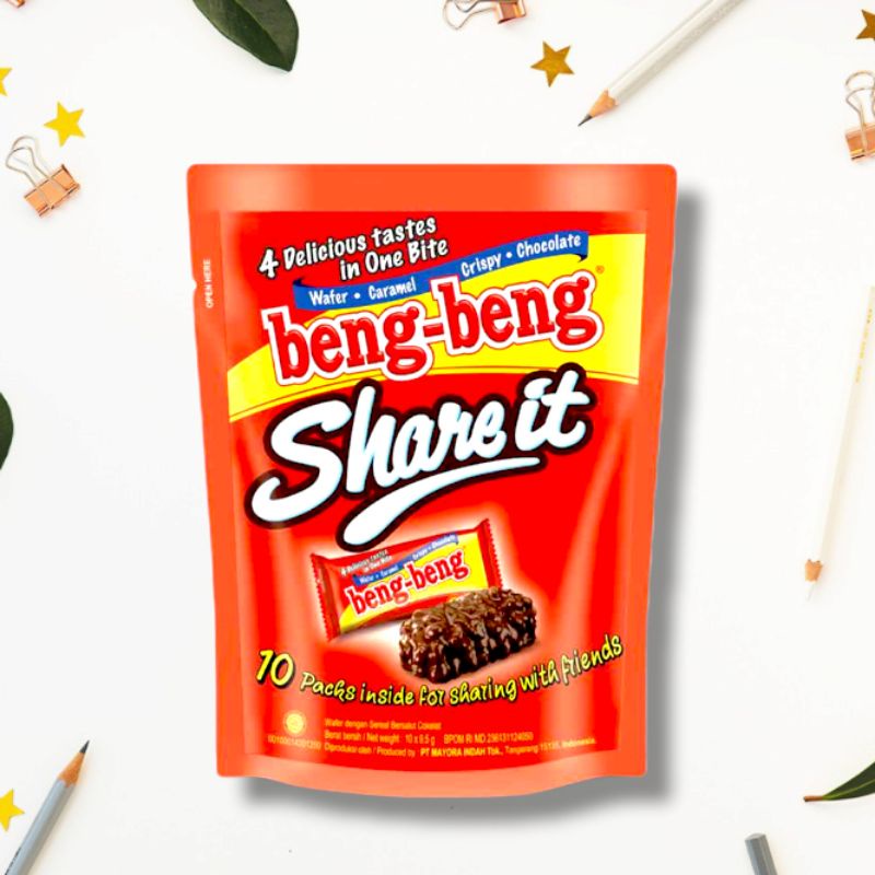 BENG-BENG Share It merupakan wafer cokelat dengan rice crispy yang berbalut cokelat susu yang nikmat. Lapisan cream yang lezat dan lembut, cemilan ini tidak bisa ditolak oleh segala usia. Sangat cocok untuk cemilan dikala senggang, dimana saja dan kapan sajaa atau ideal juga dijadikan cemilan sehat saat santai Anda bersama keluarga. kemasan